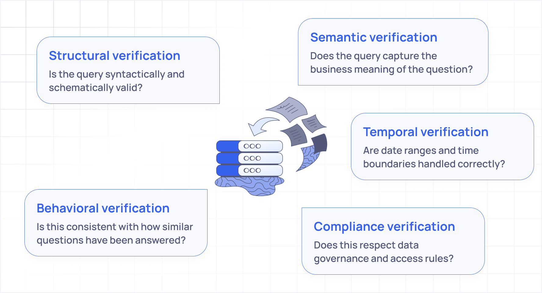 Not a single check at the end, but distributed verification throughout the process. Not one model checking itself, but multiple specialized systems examining different dimensions of correctness. Not just "is this query valid?" but "does this query accurately represent the user's intent?"